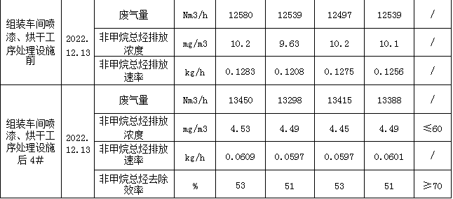 高壓車間噴漆工序處理設施后2#、組裝車間噴漆、烘干工序處理設施后4#顆粒物排放濃度滿足《大氣污染物綜合排放標準》(GB16297-1996)表2有組織顆粒物(染料塵)排放濃度<18mg/m3、二級排放速率≤0.51kg/h的標準要求;非甲烷總烴排放滿足《工業企業揮發性有機物排放控制標準》(DB13/2322-2016)表1表面涂裝業非甲烷總烴排放濃度≤60mg/m3,但不滿足最低去除效率≥70%的要求,故加測車間口無組織非甲烷總烴的濃度;苯排放濃度滿足《工業企業揮發性有機物排放控制標準》(DB13/2322-2016)表1表面涂裝業標準限值≤1mg/㎡3;甲苯與二甲苯合計排放濃度滿足《工業企業揮發性有機物排放控制標準》(DB13/2322-2016)表1表面涂裝業排放限值:≤20mg/m3。