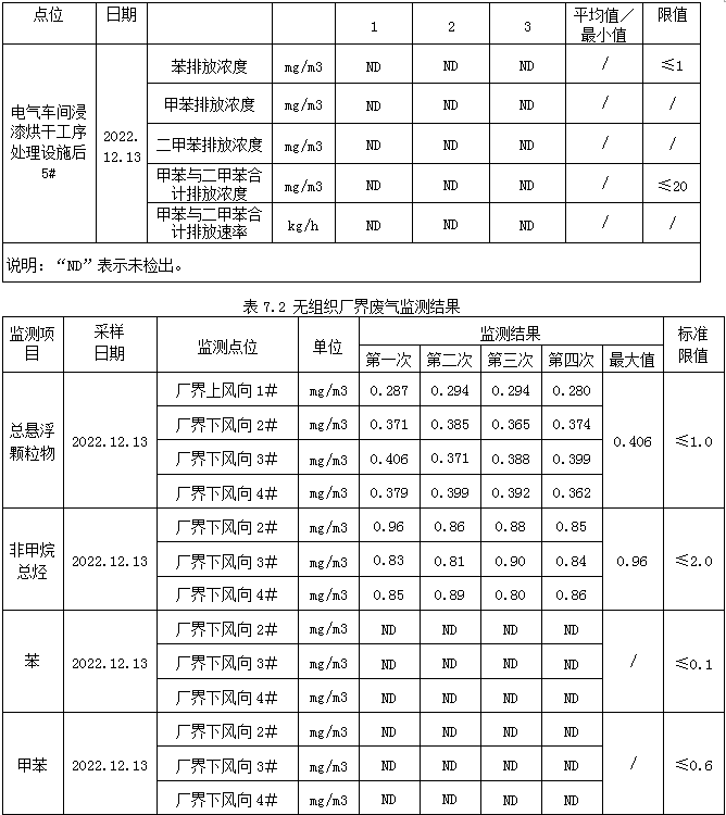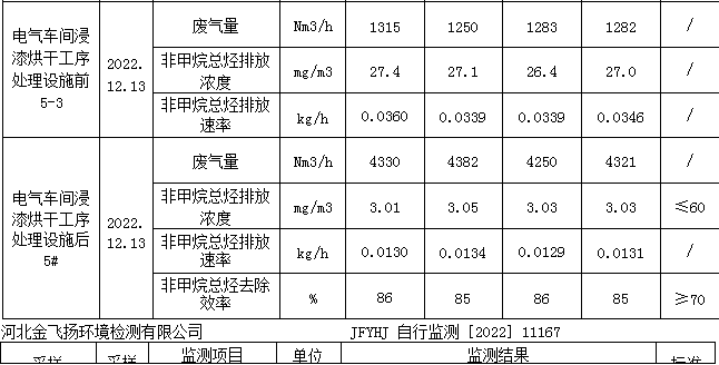 電氣車間浸漆烘干工序處理設施后5#非甲烷總烴排放滿足《工業企業揮發性有機物排放控制標準》(DB13/2322-2016)表1表面涂裝業非甲烷總烴排放濃度≤60mg/m3,最低去除效率≥70%;苯排放濃度滿足《工業企業揮發性有機物排放控制標準》(DB13/2322-2016)表1表面涂裝業標準限值≤1mg/m3;甲苯與二甲苯合計排放濃度滿足《工業企業揮發性有機物排放控制標準》(DB13/2322-2016)表1表面涂裝業排放限值:≤20mg/m3。