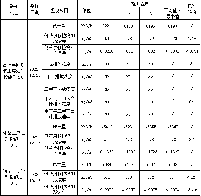 化鋁工序處理設施后3-1顆粒物排放濃度滿足《區域性大氣大氣污染物綜合排放標準》(DB37/2376-2019)中表1大氣污染物排放濃度限值≤20mg/m;鑄鋁工序處理設施后3-2顆粒物排放濃度執行《大氣污染物綜合排放標準》(GB16297-1996)表2中二級標準排放濃度≤120mg/m3、排放速率≤3.5kg/h。