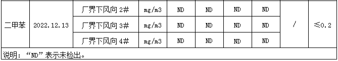 廠界下風向甲苯排放濃度滿足《工業企業揮發性有機物排放控制標準》(DB13/2322-2016)表2中其他行業標準限值≤0.6mg/m3;廠界下風向二甲苯排放濃度滿足《工業企業揮發性有機物排放控制標準》(DB13/2322-2016)表2中其他行業標準限值≤0.2mg/m3。